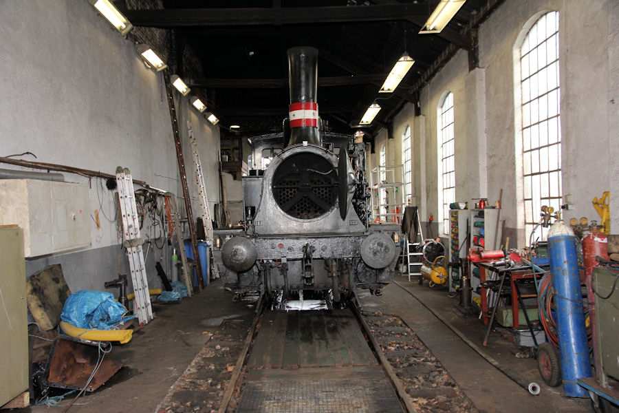 | 08.09.2011 - 13:44 Uhr - Kappeln/Schlei: Angelner Dampfeisenbahn Dampflok Julchen" - alle Federpakete eingebaut Lokschuppen Die Lok ist nicht mehr aufgebockt. Der Kessel soll nachher wieder mit Wasser aufgefüllt werden. Foto: Eckhard Schmidt - Kappeln - (C) 2011 |