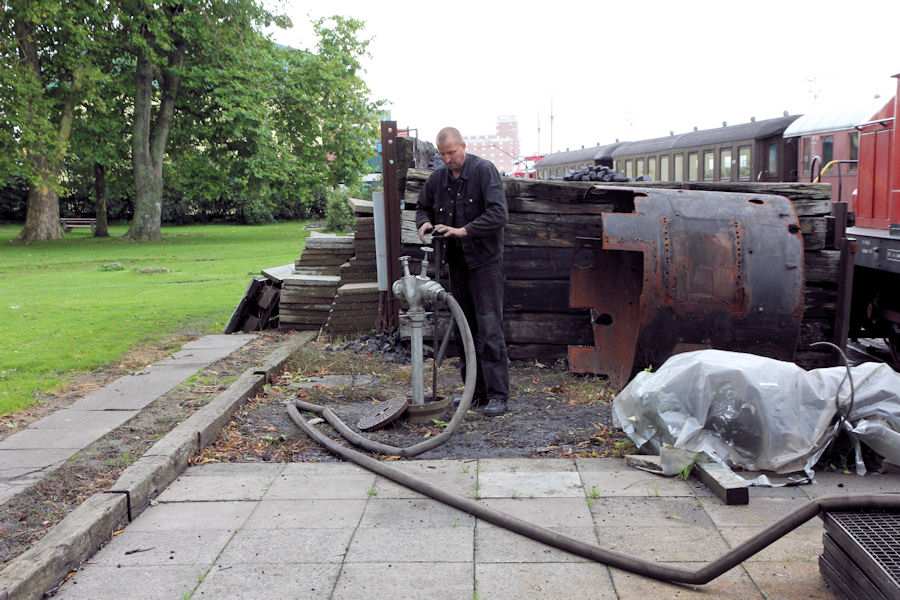 | 08.09.2011 - 14:11 Uhr - Kappeln/Schlei: Angelner Dampfeisenbahn Dampflok Julchen" - alle Federpakete eingebaut Klaus Jordt dreht das Absperrventil auf, um die den Kessel der Lok mit Wasser aufzufüllen. Foto: Eckhard Schmidt - Kappeln - (C) 2011 |