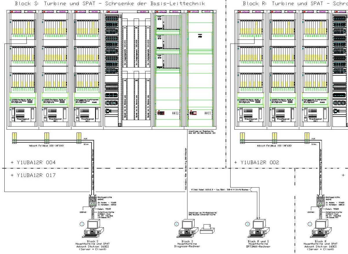 | Kraftwerk Lippendorf: Block R und S Basisleittechnik Turbine und Externe PCs Links sind die Schränke vom Block S und rechts noch ein Teil der Schränke von Block R zu sehen. Unten sind die externen PCs im Raum hinter der Warte zu erkennen. Von links nach rechts: Advant Station 160ES, Schenck-Diganose-PC und Optimax-PC (Block R und S) Eckhard Schmidt - Kappeln |