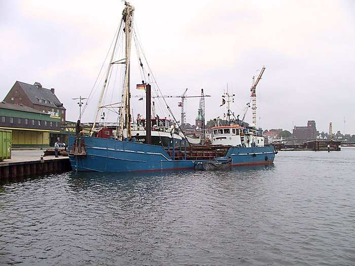 | 22.10.2001 - 11:58 Uhr - Kappeln/Schlei: Abbruch des alten ASC-Yachthafens Die ELISABETH HØJ macht gerade im Südhafen hinter einem Frachtschiff fest, um ihre Holzladung in bereitstehende Container umzuladen. Foto: Eckhard Schmidt - Kappeln - (C) 2001 |