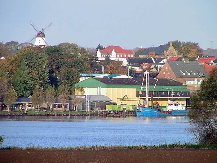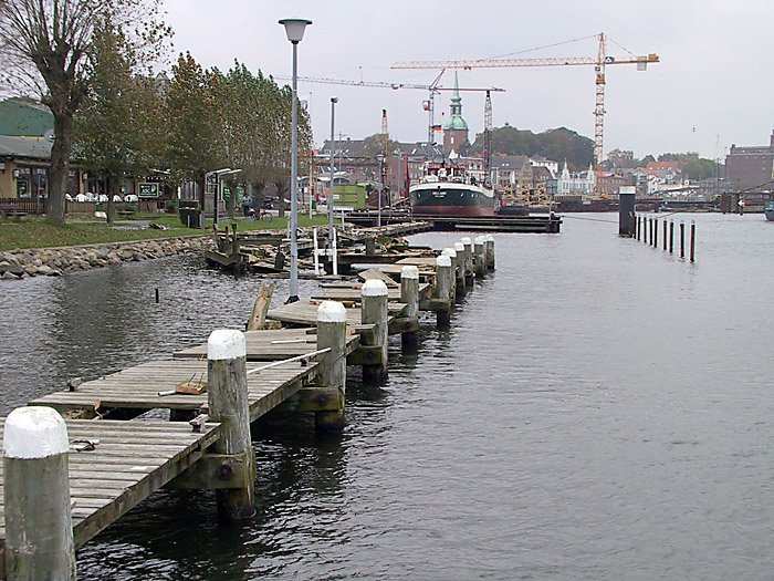 | 28.10.2001 - 9:41 Uhr - Kappeln/Schlei: Abbruch des alten ASC-Yachthafens Blick von Loitmark auf den ASC-Yachthafen. Nördlicher Teil. Die ELISABETH HØJ hat im Südhafen festgemacht. Die Reparatur des Ladebaumes wurde erfolgreich ausgeführt. Foto: Eckhard Schmidt - Kappeln - (C) 2001 |