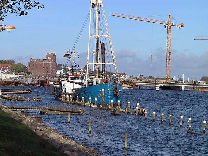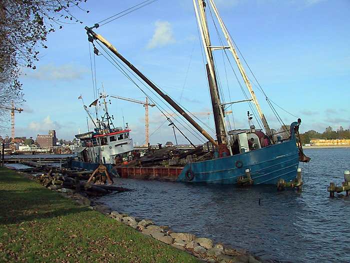 | 23.10.2001 - 12:32 Uhr - Kappeln/Schlei: Abbruch des alten ASC-Yachthafens Blick vom Ufer auf die ELISABETH HØJ. Im Moment ruhen die Arbeiten. Mittagspause. Foto: Eckhard Schmidt - Kappeln - (C) 2001 |