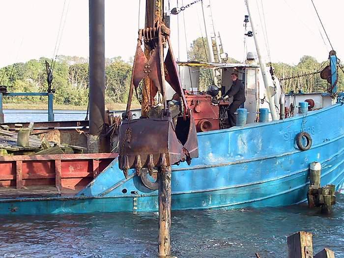 | 26.10.2001 - 12:20 Uhr - Kappeln/Schlei: Abbruch des alten ASC-Yachthafens Die SIRIUS HØJ hebt hier gerade eine Baggerschaufel gefüllt mit Schleiboden aus dem Wasser und kippt sie in den Laderaum. Foto: Eckhard Schmidt - Kappeln - (C) 2001 |