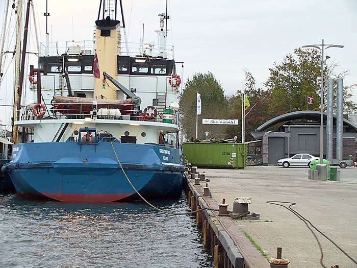 | 24.10.2001 - 11:45 Uhr - Kappeln/Schlei: Abbruch des alten ASC-Yachthafens Heute haben wir Mittwoch. Die KRISTINA HØJ hat im Südhafen festgemacht, um ihre Holzladung in Container umzuladen. Foto: Eckhard Schmidt - Kappeln - (C) 2001 |