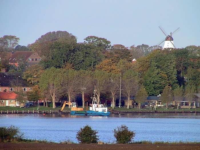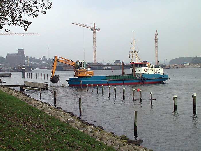 | 26.10.2001 - 12:17 Uhr - Kappeln/Schlei: Abbruch des alten ASC-Yachthafens Blick auf den Hafenbereich in Höhe des Hafenmeisterbüros. Die SIRIUS HØJ ist gerade dabei den Uferbereich tiefer auszubaggern. Foto: Eckhard Schmidt - Kappeln - (C) 2001 |