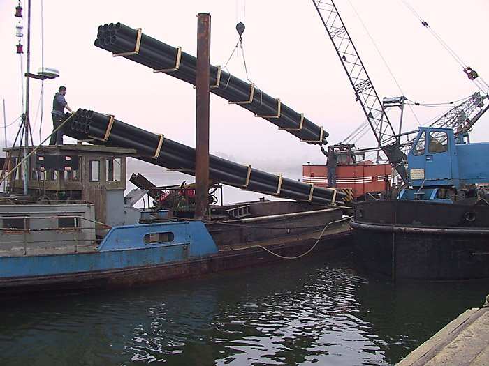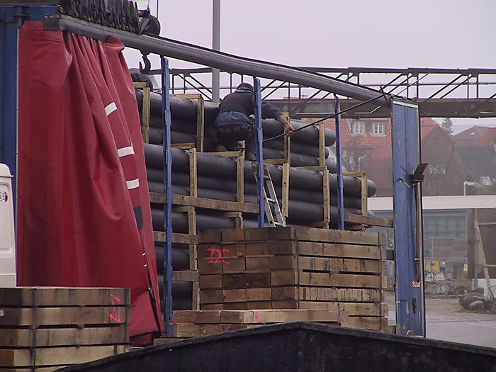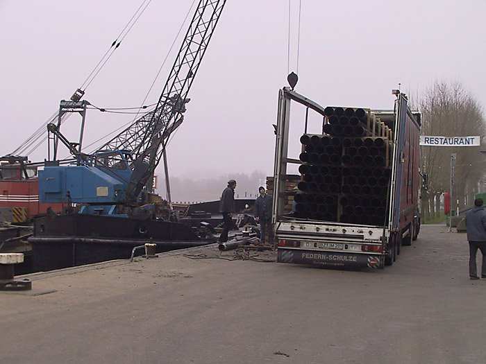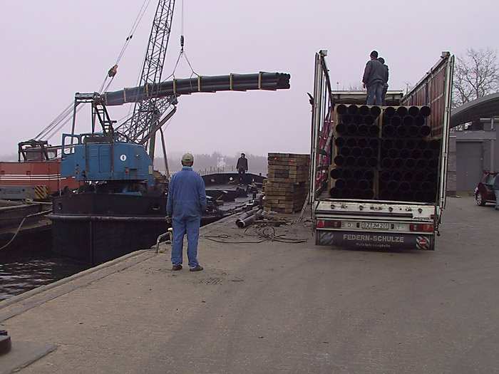 | 10.12.2001 - 12:07 Uhr - Kappeln/Schlei: Neubau des ASC-Yachthafens Gerade wird ein drittes Bündel mit Kunststoffrohren auf dem Schiff abgeladen. Foto: Eckhard Schmidt - Kappeln - (C) 2001 |