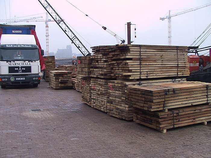 | 10.12.2001 - 11:48 Uhr - Kappeln/Schlei: Neubau des ASC-Yachthafens Blick auf die Holzstapel für die Brücken des Yachthafens. Das Holz lagert direkt vor dem Pumpenhaus im Südhafen. Foto: Eckhard Schmidt - Kappeln - (C) 2001 |