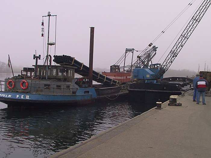 | 10.12.2001 - 12:05 Uhr - Kappeln/Schlei: Neubau des ASC-Yachthafens Blick auf das Arbeitsschiff P.E.II" mit den ersten beiden Bündeln Kunststoffrohre. Foto: Eckhard Schmidt - Kappeln - (C) 2001 |