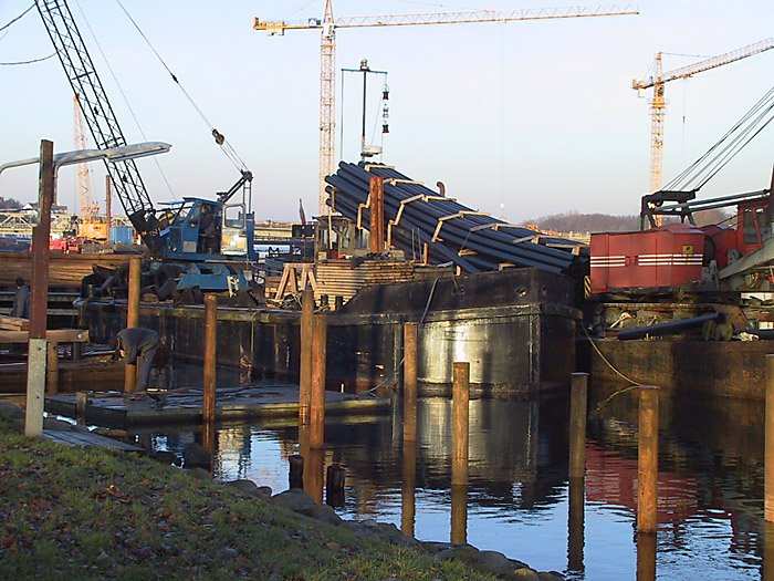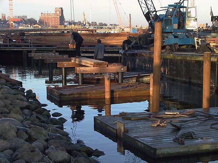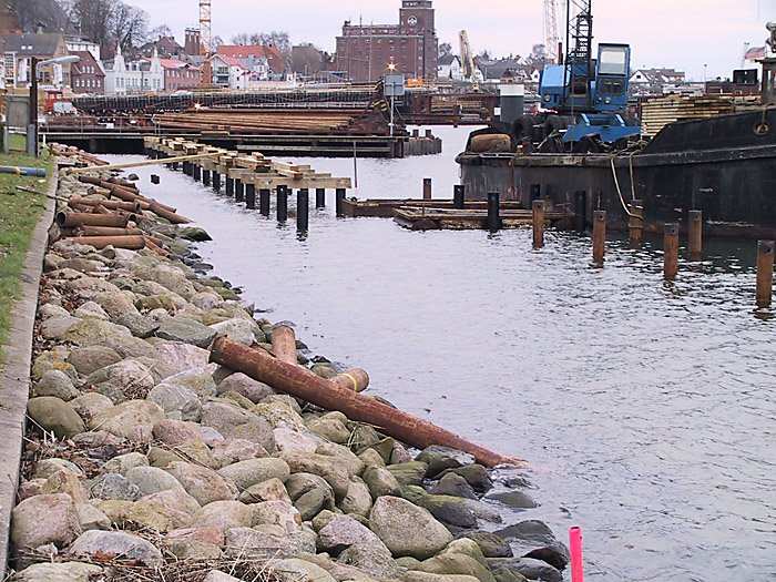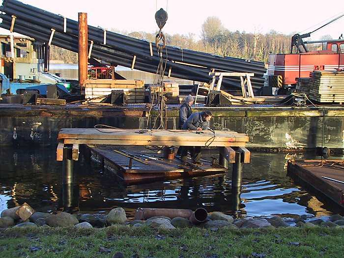 | 11.12.2001 - 14:40 Uhr - Kappeln/Schlei: Neubau des ASC-Yachthafens Blick von Süden auf den nördlichen Teil der Innenbrücke. Es wird gerade ein Brückenpfahl mit Hilfe eines Schweißbrenners verkürzt. Foto: Eckhard Schmidt - Kappeln - (C) 2001 |