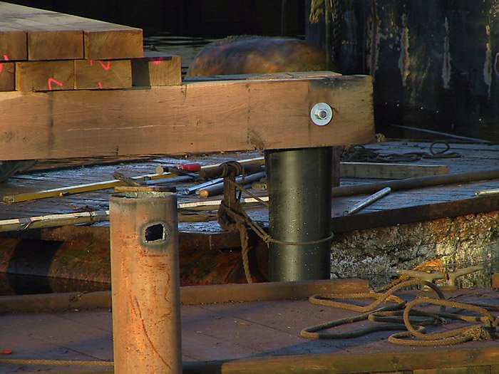 | 11.12.2001 - 14:39 Uhr - Kappeln/Schlei: Neubau des ASC-Yachthafens Im Vordergrund ein gekürzter Stahlpfahl mit Loch für die Befestigungsbolzen der Querbalken aus Holz. Rechts ist ein Stahlpfahl mit Kunststoffüberzugsrohr und bereits montierten Querbalken aus Holz zu erkennen. (2 Stück Querbalken pro Pfahlgruppe) Foto: Eckhard Schmidt - Kappeln - (C) 2001 |