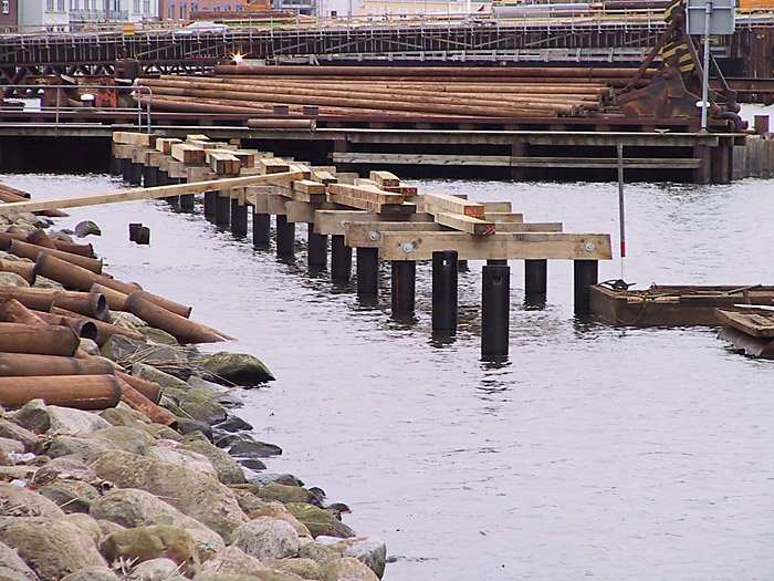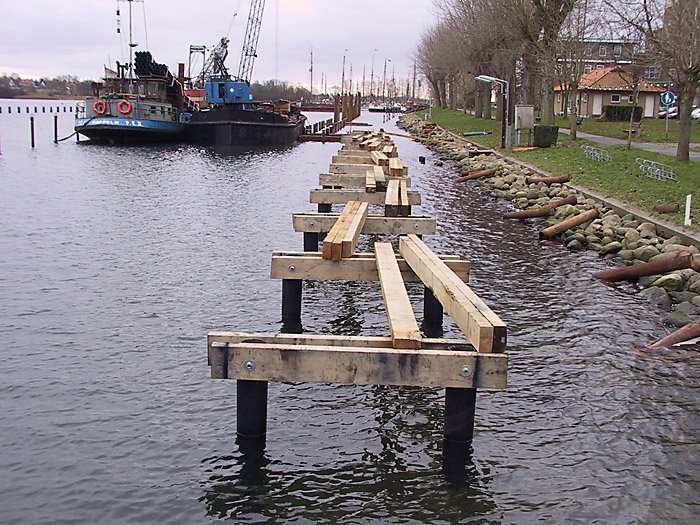 | 13.12.2001 - 12:23 Uhr - Kappeln/Schlei: Neubau des ASC-Yachthafens Blick vom Südhafen auf die Innenbrücke des neuen ASC-Yachthafens: Momentan werden die Brückenpfähle gekürzt und die Querbalken aus Holz montiert. Die Längsbalken liegen bereits bereit. Foto: Eckhard Schmidt - Kappeln - (C) 2001 |
