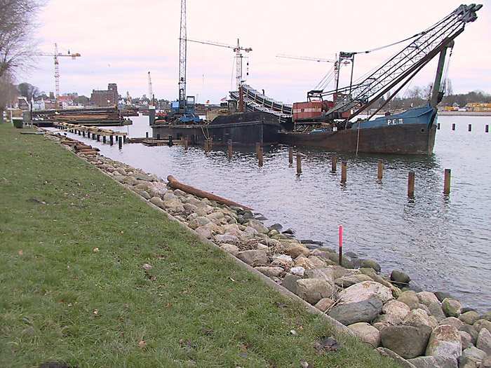 | 13.12.2001 - 12:26 Uhr - Kappeln/Schlei: Neubau des ASC-Yachthafens Blick von Süden auf die Innenbrücke des neuen Yachthafens. Am Ufer lagern die abgebrannten Enden der Stahlpfähle. Im Hintergrund ist die Baustelle der neuen Schleibrücke zu erkennen. Foto: Eckhard Schmidt - Kappeln - (C) 2001 |