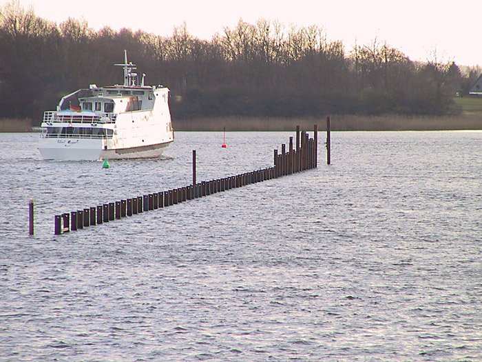 | 13.12.2001 - 14:53 Uhr - Kappeln/Schlei: Neubau des ASC-Yachthafens Blick von der neuen Schleibrücke auf die Doppel-T-Träger für die Schwallschutzwand der Außenbrücke. Die Rammarbeiten wurden unterbrochen. Das Fahrgastschiff Stadt Kappeln" passiert gerade die Baustelle in Richtung Arnis. Foto: Eckhard Schmidt - Kappeln - (C) 2001 |
