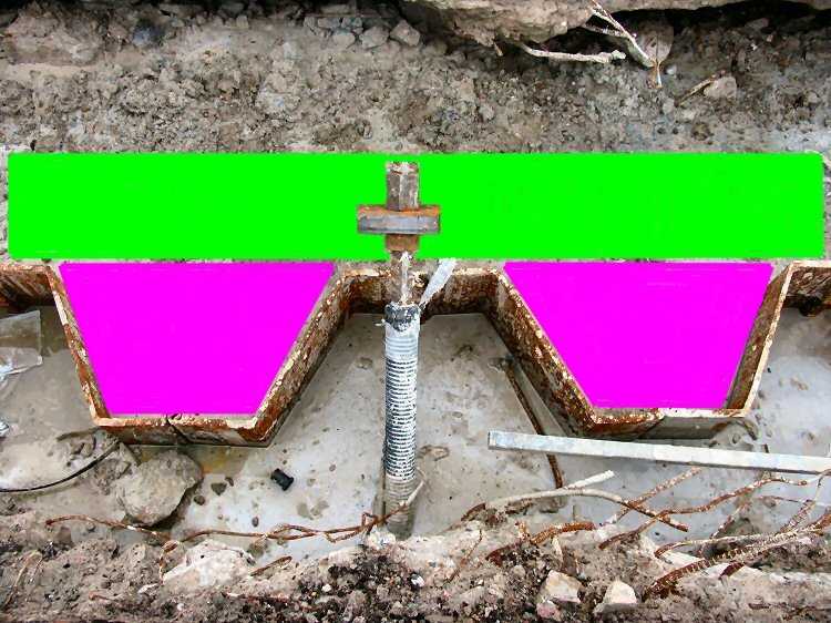 | Kappeln/Schlei - Nordhafen: Tagesliegerhafen Hier habe ich mal bei einem Stück Spundwand die vorgehängte Betonplatte mit der Farbe grün" und die trapezförmigen Fertigteile mit der Farbe magenta" angedeutet. In der Mitte des Bildes ist ein GEWI-Pfahl mit einer quadratischen Stahlplatte und den zugehörigen Muttern zu erkennen. |