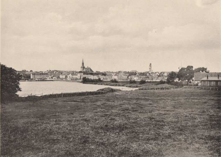| Panorama von Kappeln/Schlei (ca. 1910) Alle Schwarzweißaufnahmen in diesem Beitrag stammen aus dem Bildband Kappeln", erschienen im Verlag Kock´s Buchhandlung - Kappeln. In dem Bildband ist kein Erscheinungsdatum angegeben. Fast alle Bilder habe ich noch einmal aus der heutigen Sicht (2004) aufgenommen. (Foto: Kappeln - Stadtarchiv) |