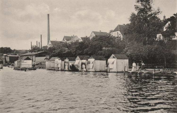 | Riepersche Badeanstalt (ca. 1910) Früher konnte man hier mal ein Bad in der Schlei nehmen. (Foto: Kappeln - Stadtarchiv) |