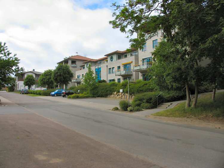 | Standort des Strandhotels (6. Juni 2004) Vorne im Bild ist der Bahnhofsweg zu erkennen. Rechts davon stand früher das Strandhotel. Das Strandhotel wurde 1997 abgerissen und durch den obigen Neubau ersetzt. In dem Gebäude befinden sich 22 Eigentumswohnungen. Eine von diesen Wohnungen bewohne ich. Von hier aus gehen die Fotobeiträge dieser Webseite in die weite Welt. Der Server meiner Homepage steht momentan in Berlin. |