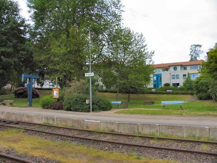 | Standort des Strandhotels (6. Juni 2004) Blick vom Bahnhofsgelände in Richtung des ehemaligen Strandhotels. Das Bahnhofsgebäude der Schleswiger Kreisbahn gibt es nicht mehr. Es wurde vor einigen Jahren abgerissen. Die Schienen Kappeln - Süderbrarup werden heute nur noch von der Angler Museumsbahn genutzt. |