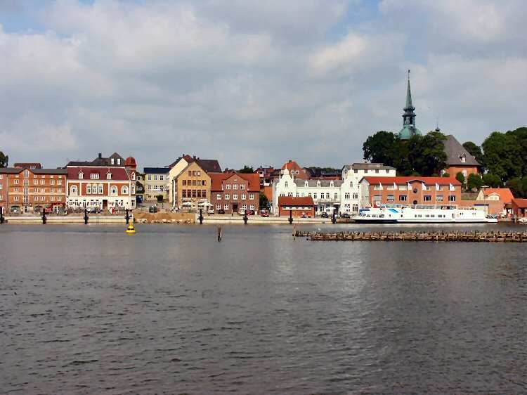 | Panorama von Kappeln/Schlei (6. Juni 2004) Das Panorama von Kappeln hat sich doch im Laufe der Zeit stark gewandelt. Die Pontonbrücke (siehe Bild oben) wurde im Jahre 1927 durch eine Drehbrücke ersetzt. Die Drehbrücke wurde 2002 durch eine Klappbrücke ersetzt. Den Wasserturm gibt es auch schon seit vielen Jahren nicht mehr. Am Standort des Elektrizitätswerkes von Martin Klencke steht heute ein Backsteinspeicher der Getreide AG. Dieser Speicher wird auch schon seit einigen Jahren nicht mehr genutzt. |
