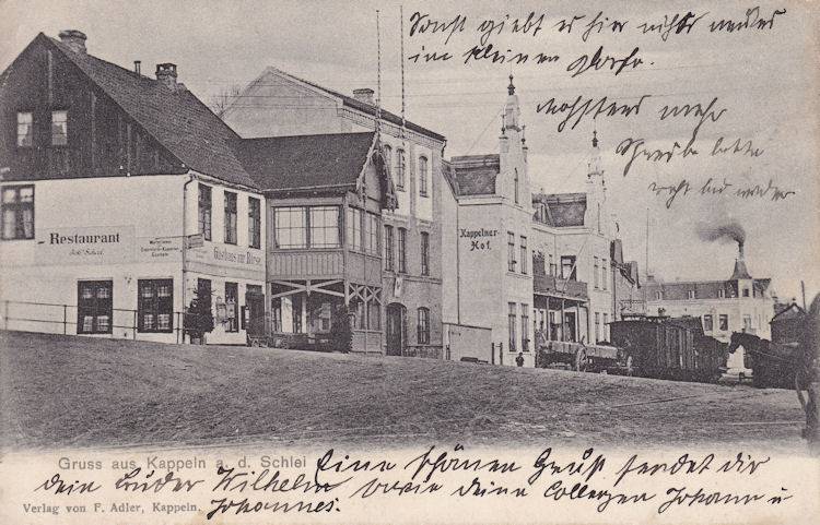 | Kappeln/Schlei: Historische Ansichtskarte Ecke Fährberg / Am Hafen Gasthaus Zur Börse", Zollamt und Bahnhofshotel Kappelner Hof" Gasthaus Zur Börse" -> Hist-1300 Zollamt (PDF-Datei) Bahnhofshotel Kappelner Hof" (PDF-Datei) Karte: gelaufen - Poststempel: 1905 Ansichtskarte: Aus dem Besitz von Eckhard Schmidt - Kappeln |