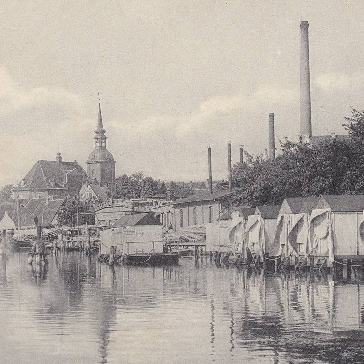| Kappeln/Schlei: Historische Ansichtskarte Nordhafen mit der Badeanstalt von Johannes Rieper Links: Sägewerk und E-Werk von Martin Klencke Zwischen dem Sägewerk und der Badeanstalt befindet sich der 2. Lokschuppen der Flensburger Kreisbahn in Massivbauweise. Karte: gelaufen - Poststempel: 1910 Ansichtskarte (Ausschnitt): Aus dem Besitz von Eckhard Schmidt - Kappeln |