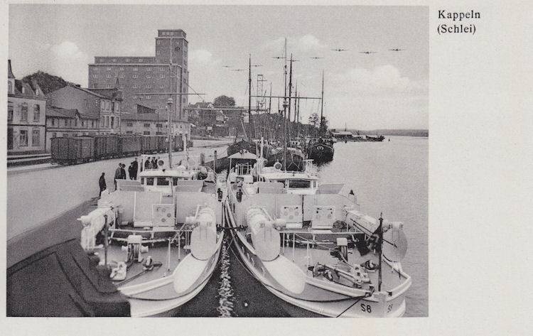| Kappeln/Schlei: Historische Ansichtskarte Nordhafen Karte: nicht gelaufen - Poststempel: -- Im Nordhafen haben zwei Schnellboote der Kriegsmarine festgemacht. Aufnahme: Vor dem 2. Weltkrieg Ansichtskarte: Aus dem Besitz von Eckhard Schmidt - Kappeln |