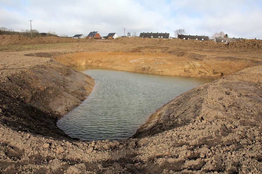 | Bild 3/12 Der kleinere Teich des Regenrückhaltebeckens. Über ein Rohr (oben im Bild) wird das Regenwasser in diesen Teich eingeleitet. |