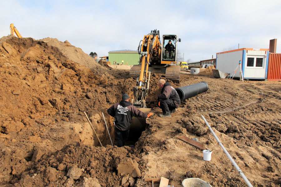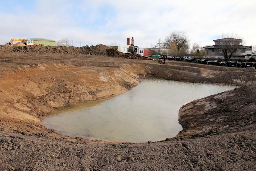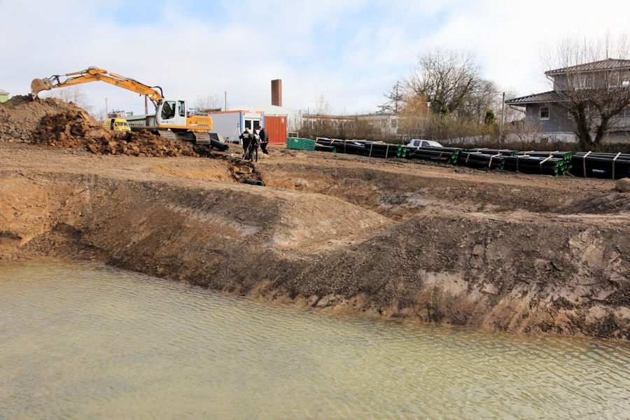 | Bild 8/12 Es wird gerade ein Kunststoffrohr von dem kleineren Teich des Regenrückhaltebeckens in Richtung Norden verlegt. |
