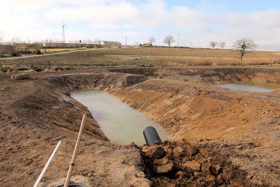 | Bild 7/12 Über ein Kunststoffrohr wird das Regenwasser in den kleineren Teich des Regenrückhaltebeckens eingeleitet. |