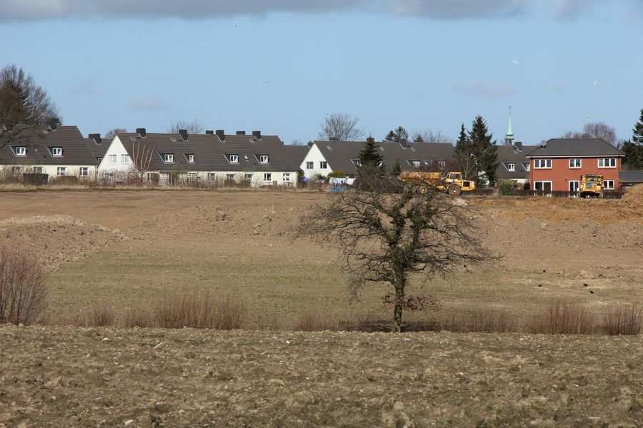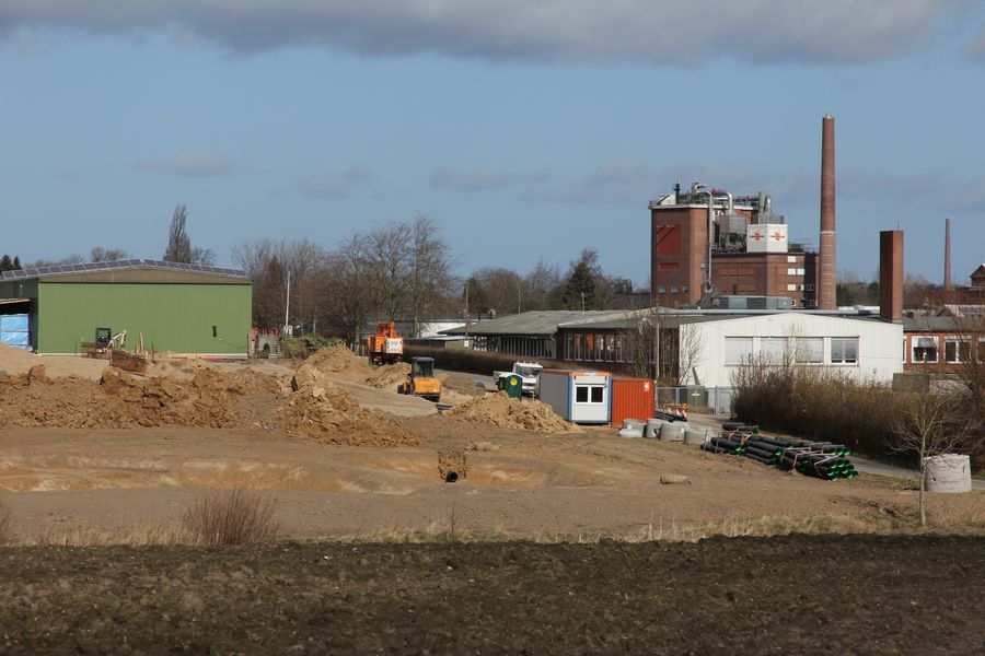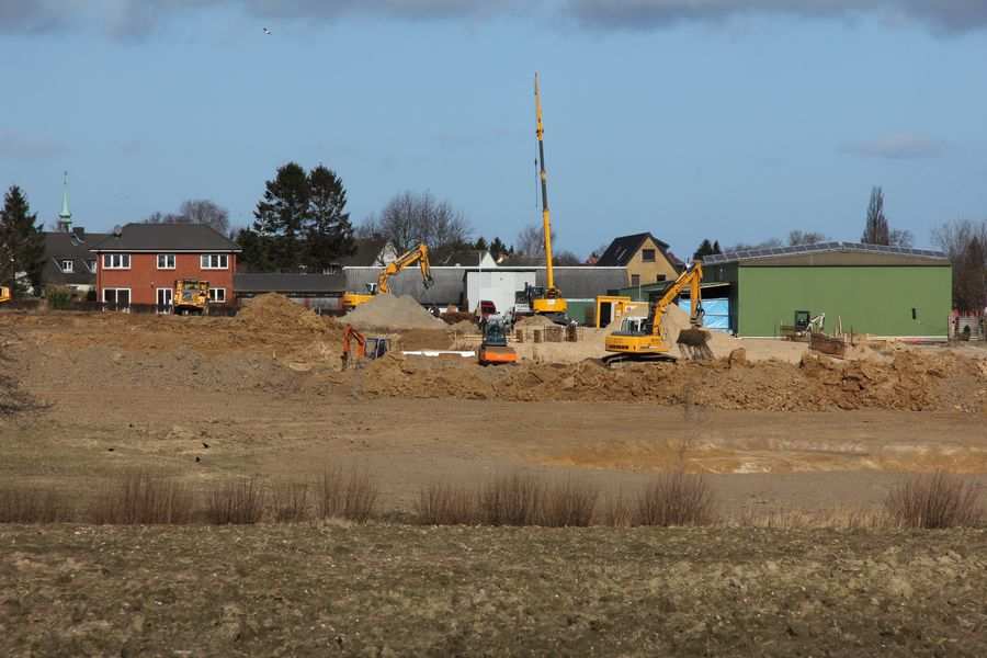 Bild 12/12 Blick von Nordwesten quer über die Baustelle der Halle 1 in Richtung Südosten. Rechts hinter mir wird gerade Boden mit Hilfe eines Baggers abgetragen. Links im Bild ist die grüne Halle nördlich der zu bauenden Halle 1 zu erkennen. |