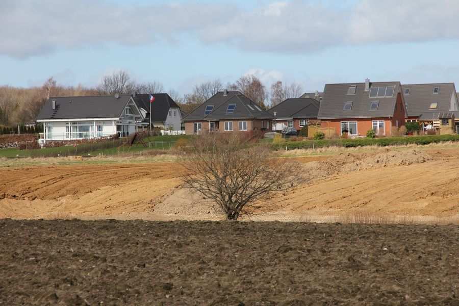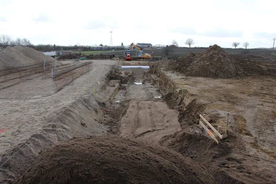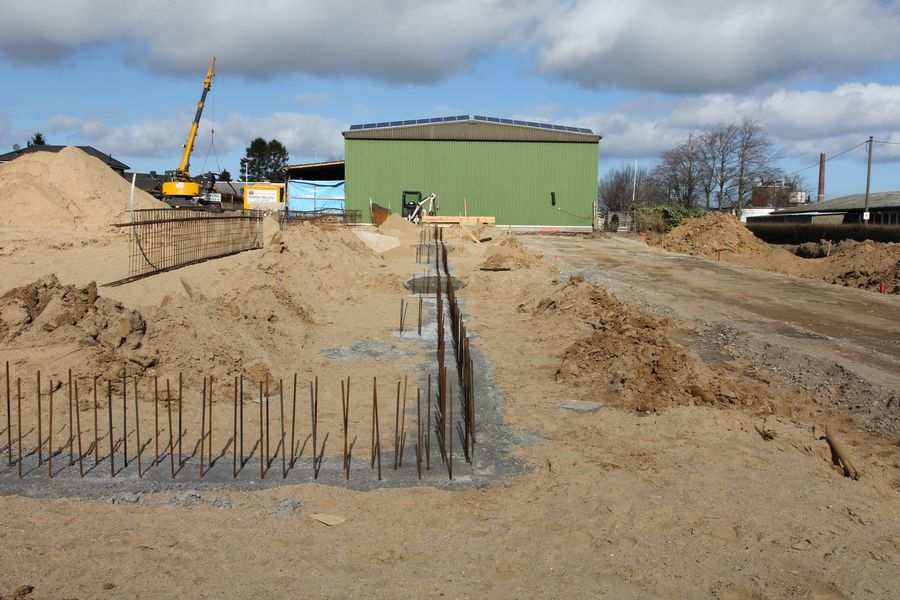 Bild 2/12 Betonfundament mit Anschlusseisen Blick von der Südostecke der Halle 1 in Richtung Norden Am rechten Bildrand hinter den den Erdhaufen befindet sich die Arnisser Straße. |
