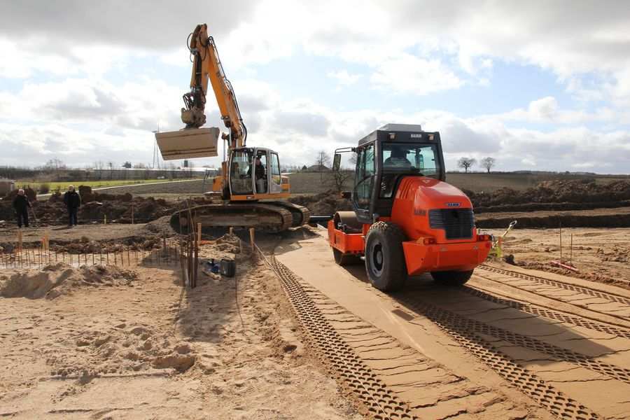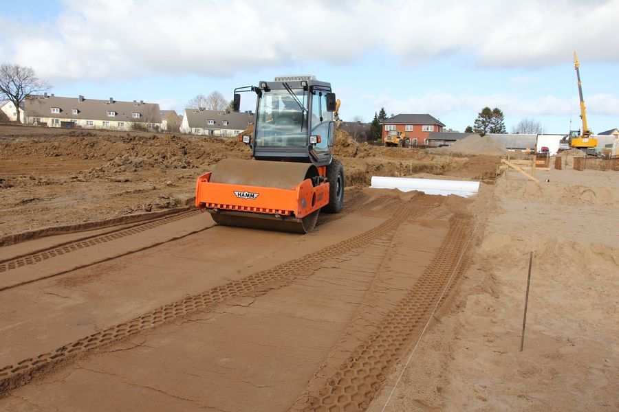 Bild 4/12 Es wird gerade die Sandschicht mit Hilfe der Vibrationswalze festgewalzt. |