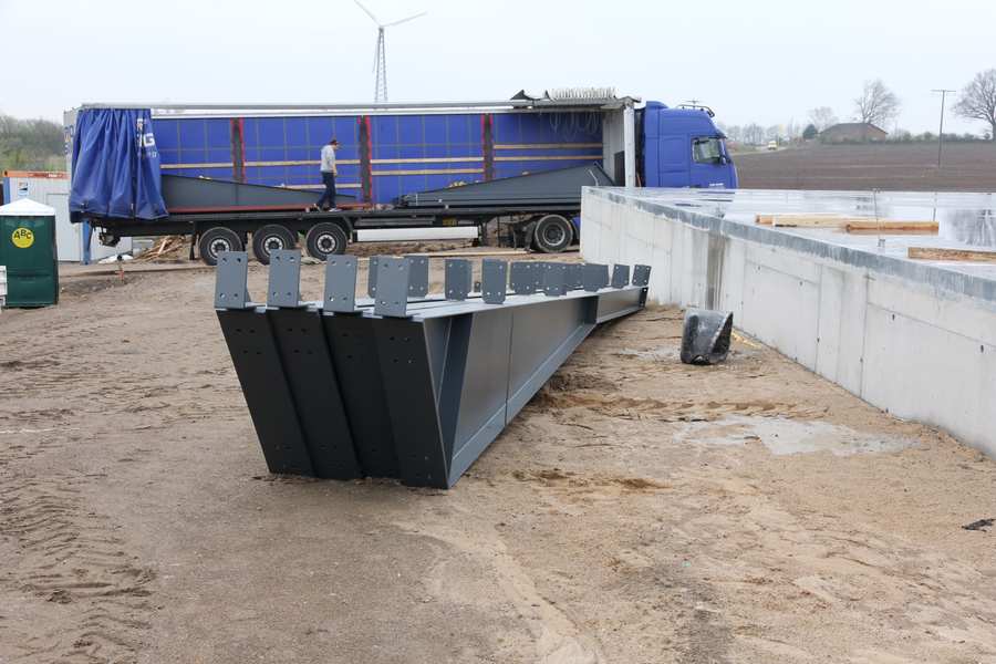 | Bild 2/3 Baugelände der Werkhalle Stahlbauer der Firma Ernst Hallenbau sind gerade dabei die Stahlbauteile für die Halle von dem blauen LKW abzuladen. |