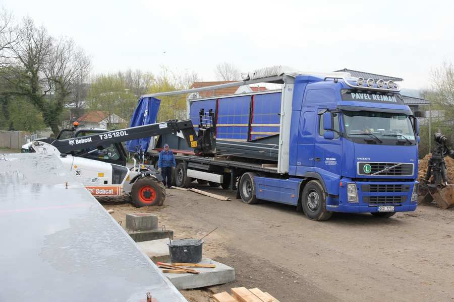 | Bild 5/15 Baugelände der Werkhalle Ostseite Die Stahlbauer sind dabei die Stahlbauteile für die Halle von einem LKW abzuladen. |