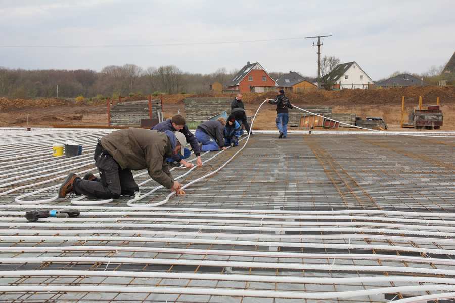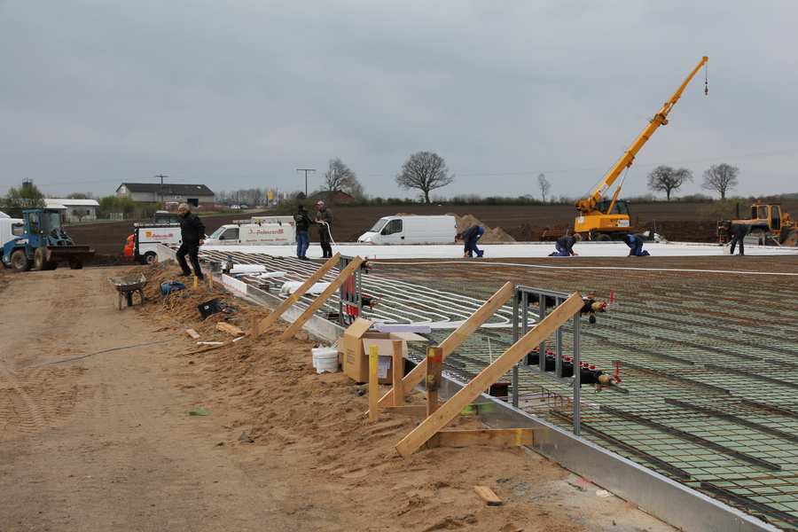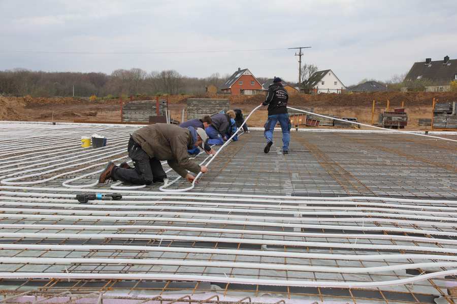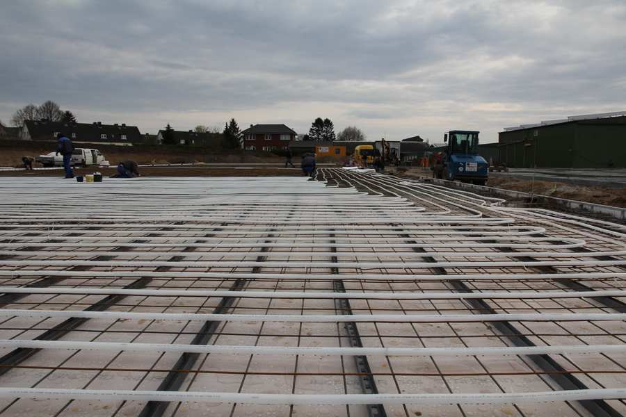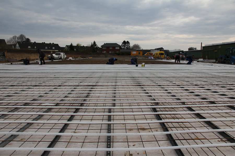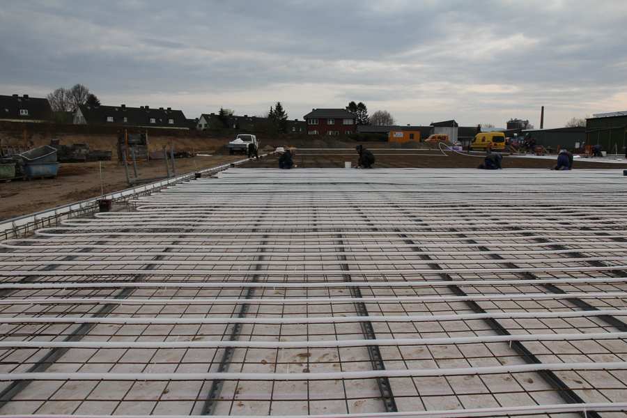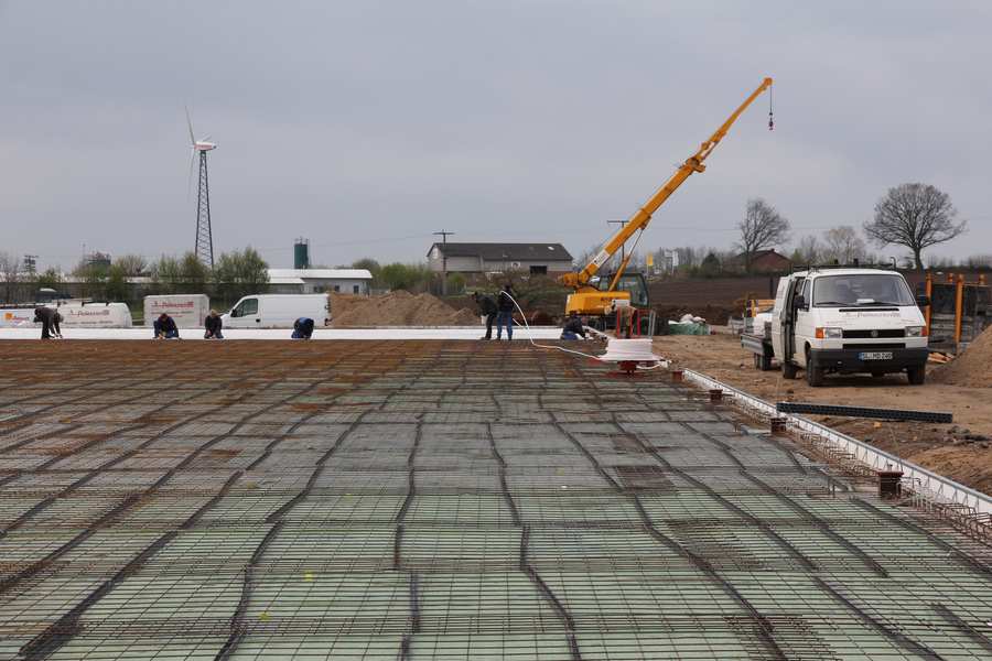 Bild 2/30 Baugelände der Lagerhalle Ansicht von Norden Die Heizungsbauer sind gerade dabei die Rohrleitungen für die Fußbodenheizung auf den Bewehrungsmatten zu verlegen. |
