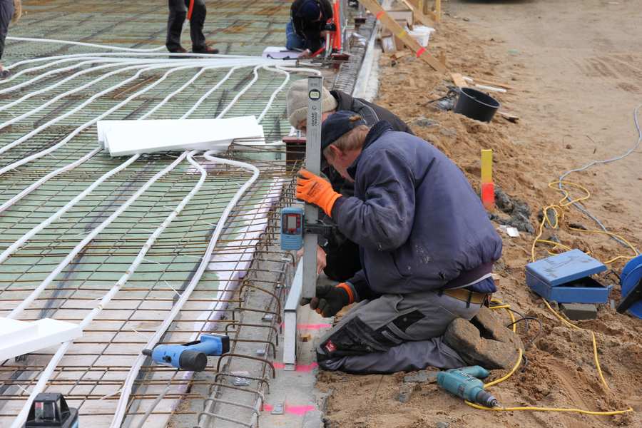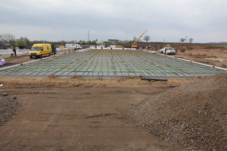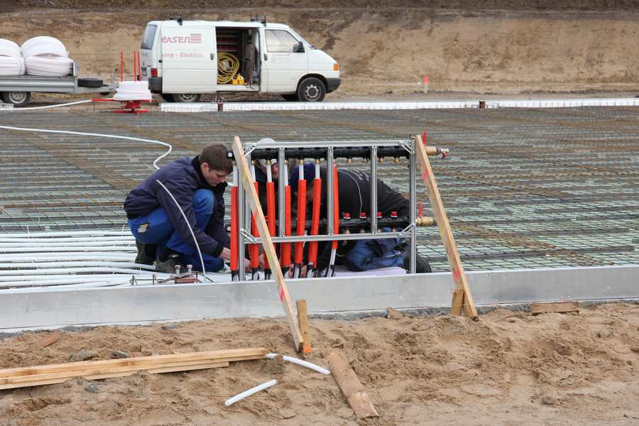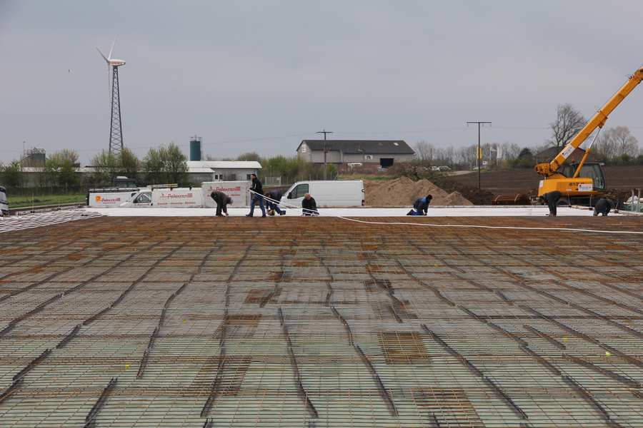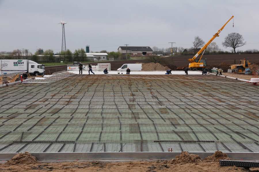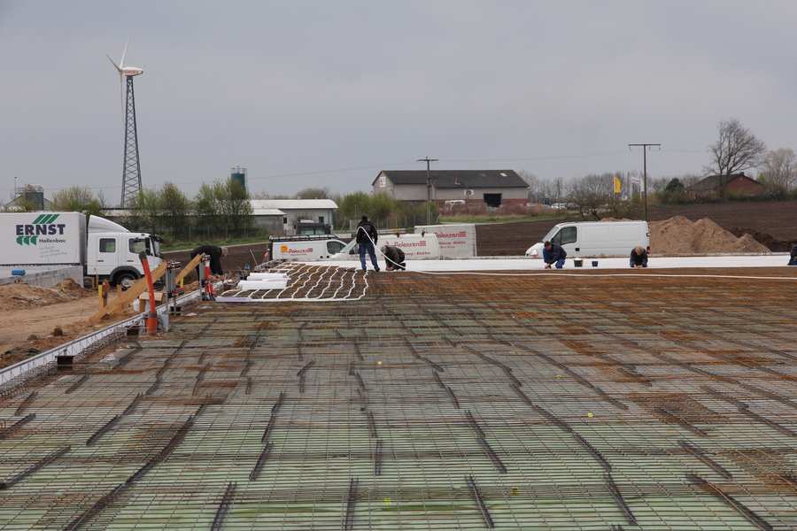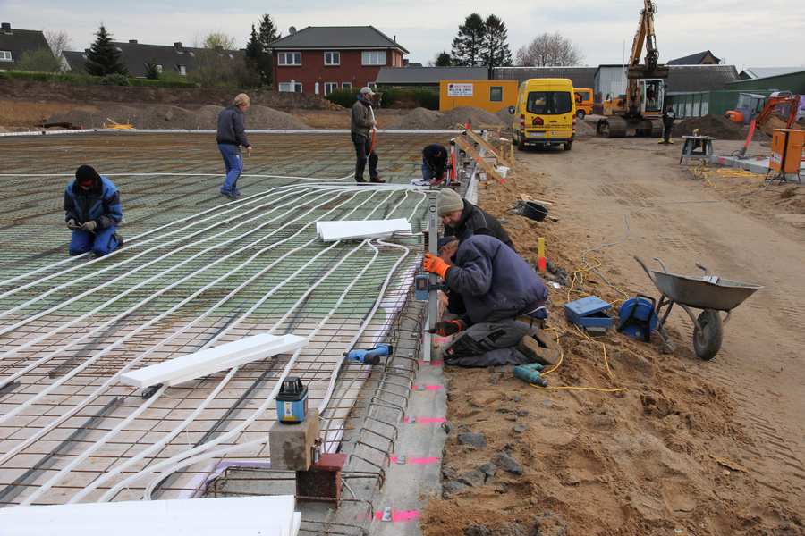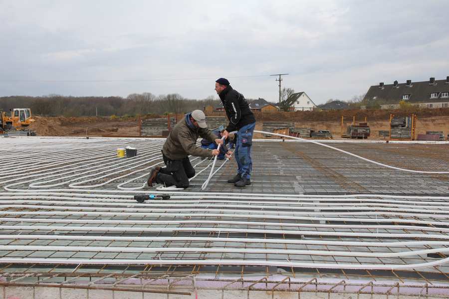 Bild 2/30 Baugelände der Lagerhalle Ansicht von Norden Die Heizungsbauer sind gerade dabei die Rohrleitungen für die Fußbodenheizung auf den Bewehrungsmatten zu verlegen. |