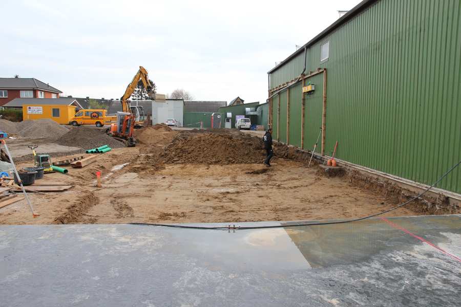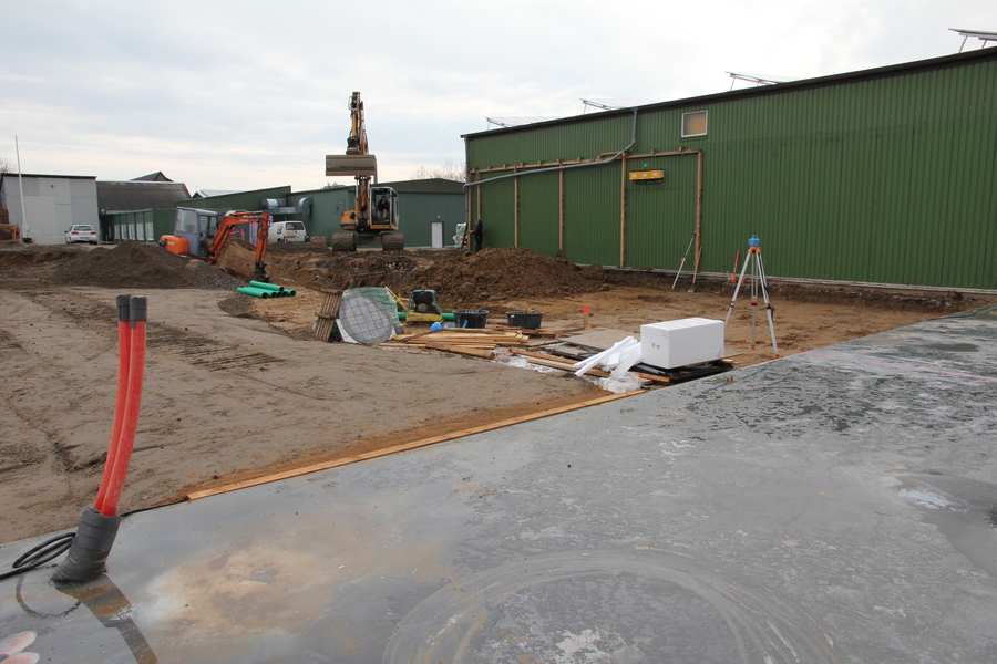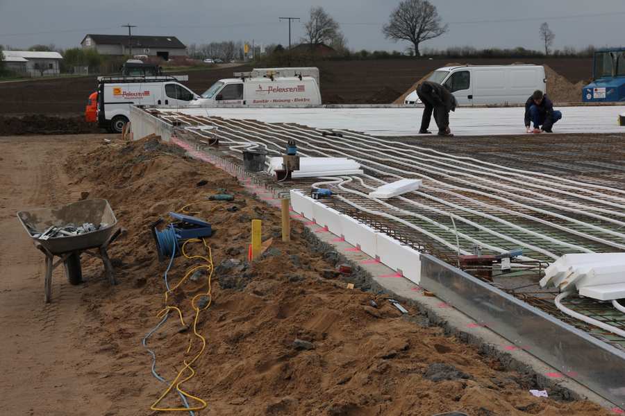 Bild 7/30 Baugelände der Lagerhalle Ostseite Die Rohrleitungen der Fußbodenheizungen werden im Augenblick bis zu dem südlichen Heizkreisverteiler verlegt. |