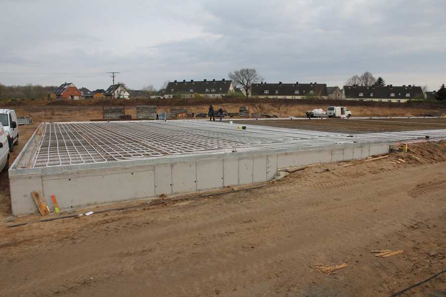 Bild 6/30 Baugelände der Lagerhalle Ostseite Die Rohrleitungen der Fußbodenheizungen werden im Augenblick bis zu dem südlichen Heizkreisverteiler verlegt. |