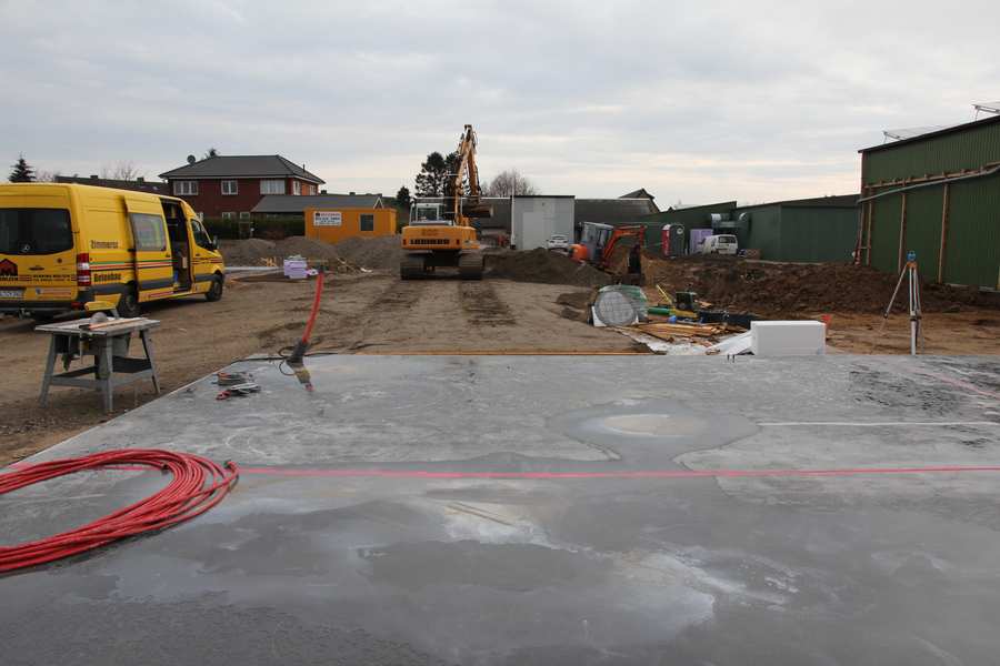 Bild 13/30 Baugelände der Lagerhalle Ansicht von Osten Es wird gerade eine Rohrleitung der Fußbodenheizung von Ost nach West verlegt. |