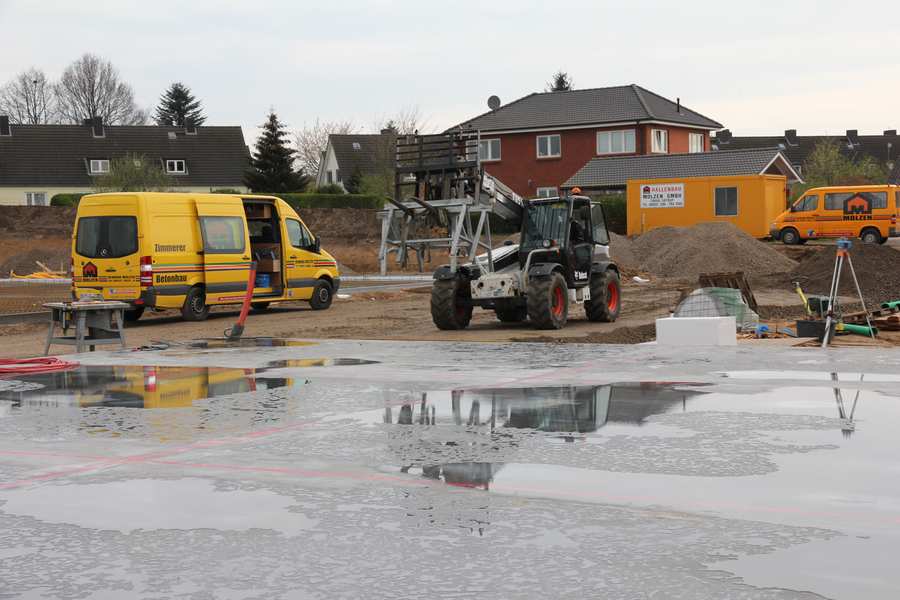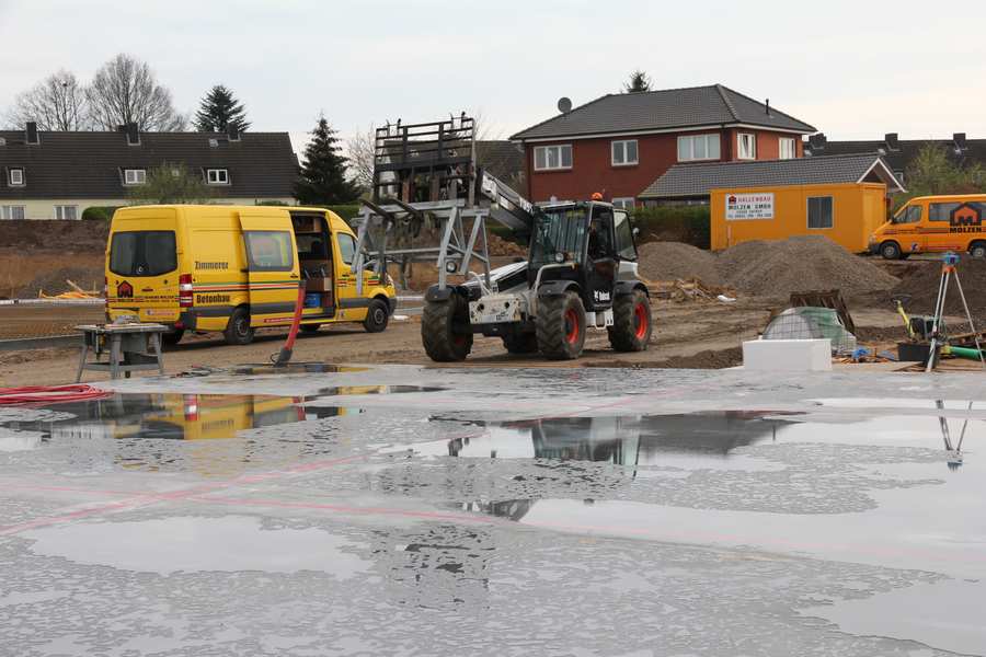Bild 30/30 Betonsohle der Werkhalle Nordseite Premiere. Die Stahlbauer befahren gerade zum Erstenmal über die Rampe mit ihrem Teleskop-Lader die Betonsohle der Halle. |