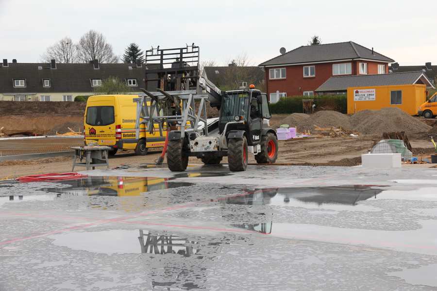 Bild 28/30 Betonsohle der Werkhalle Nordseite Premiere. Die Stahlbauer befahren gerade zum Erstenmal über die Rampe mit ihrem Teleskop-Lader die Betonsohle der Halle. |
