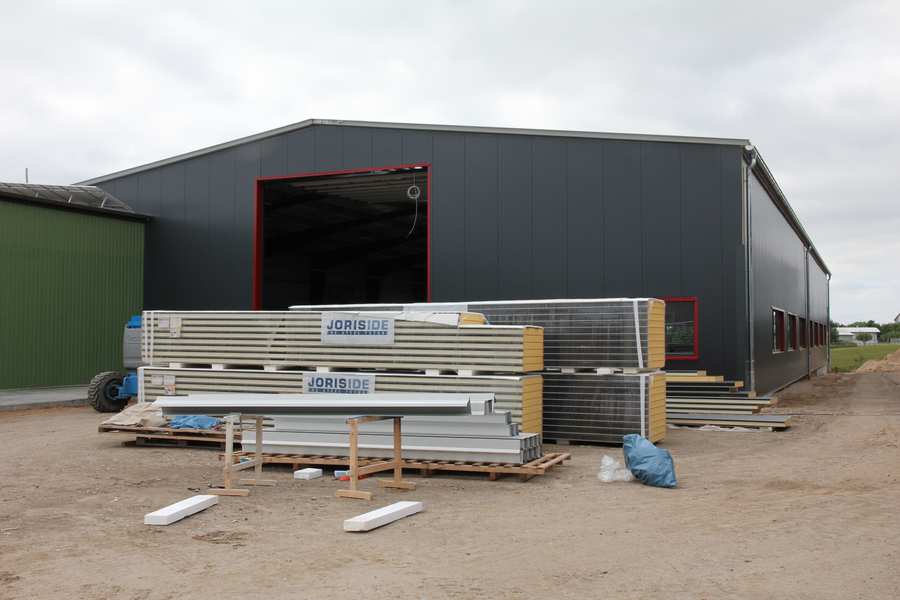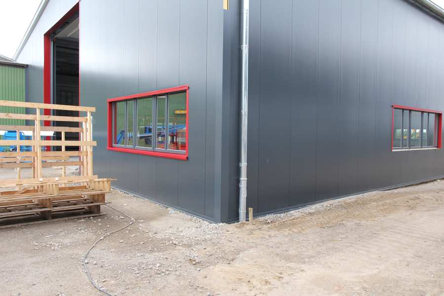 Bild 7/12 Werkhalle Nord- und Westseite Fensterbänke: Einbau der roten Profilbleche Ecken der Halle: Einbau der dunklen Eckbleche |