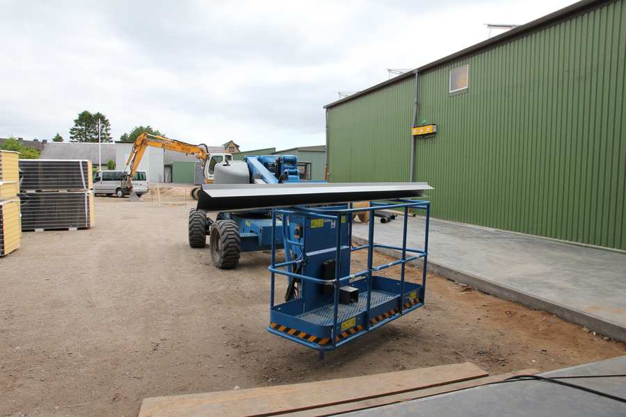 Bild 10/12 Giebel: Stirnflächen Mit Hilfe eines Steigers werden die hellen Profilbleche montiert. Die Hallenbauer machen gerade Pause. |