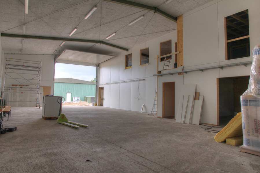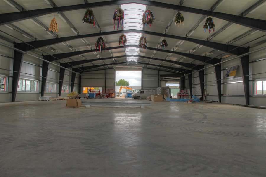 HDR-Bild 12/12 Werkhalle Ansicht von Süden Rechts vom Rolltor der Halle befindet sich der Durchgang zur bestehenden grünen Halle nordöstlich der Werkhalle. Mangels Stativ habe ich die Kamera auf das verpackte Rolltor der Lagerhalle gelegt. |