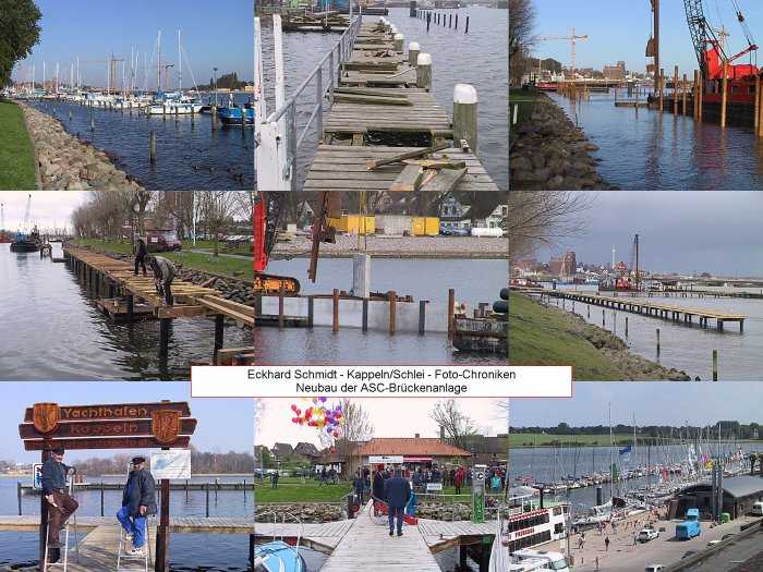 Fotos vom Neubau des ASC-Yachthafens und den Folgejahren Am 15.10.2001 wurde mit den Bauarbeiten für einen neuen ASC-Yachthafen begonnen. Bei dem alten ASC-Yachthafen hatte bei den verwendeten Holzpfählen der Schiffsbohrwurm" Toredo navalis sein zerstörerisches Werk begonnen. Der Schiffsbohrwurm" trägt seinen Namen zu unrecht, da er in Wirklichkeit eine Muschel ist und wurde vor 250 Jahren von Amerika nach Europa in Schiffsplanken eingeschleppt. Seitdem richtet er dramatische Schäden an Schiffen, Buhnen, Hafeninstallationen, Pfahlbauten und Brückenstützpfeilern an. (Quelle: Senckenberg) Der ASC-Vorsitzende Thies Kölln hatte mich angesprochen: Wenn Du schon Fotos von der neuen Schleibrücke machst, dann kannst Du Dich ja auch mal umdrehen und von unserer Brücke welche machen." So wurde auch noch das Kapitel ASC zu meiner Webseite hinzugefügt. Als erstes wurde der alte ASC-Yachthafen abgebrochen. Ziehen aller Holzpfähle. Dann wurden alle Brückenpfähle aus Stahl (ehemaliges Bohrgestänge) gerammt. Bei der Außenbrücke wurden zum Fahrwasser hin Doppel-T-Träger verwendet. In die Träger wurde von oben ca. 1,8 m hohe Betonplatten eingehängt. Die Platten dienen als Schwallschutz. Nach den Rammarbeiten konnte mit den Holzarbeiten für den Brückenbelag begonnen werden. Noch während die Holzarbeiten liefen, wurden die Wasserleitungen und Elektrokabel verlegt. Die Liegeplätze sind mit Wasser- und Elektroanschluss ausgerüstet. Nach Abschluss der Bauarbeiten im April 2002 wurde dann der neue ASC-Yachthafen am 4. Mai 2002 mit einem zünftigen Brückenfest eingeweiht. |