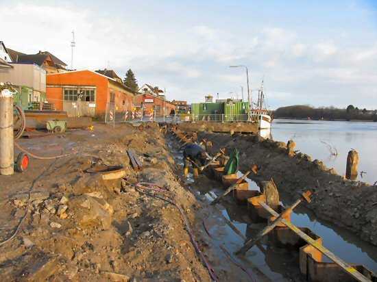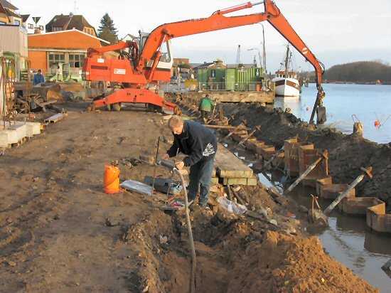 | 03.01.2005 - Nordhafen: Abriss Spannbetonkaiplatte und Neubau Tagesliegerhafen Heute haben wir Niedrigwasser in der Schlei. Thomas Dittmann hebt hinter der Spundwand Löcher aus, damit hier Löcher zur Befestigung der Betonplatten in die Bohlen gebrannt werden können. |