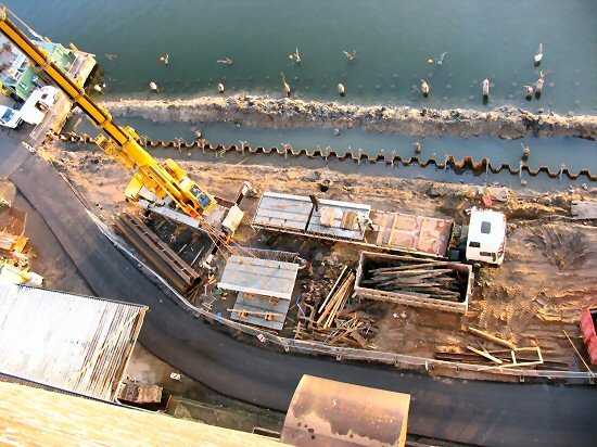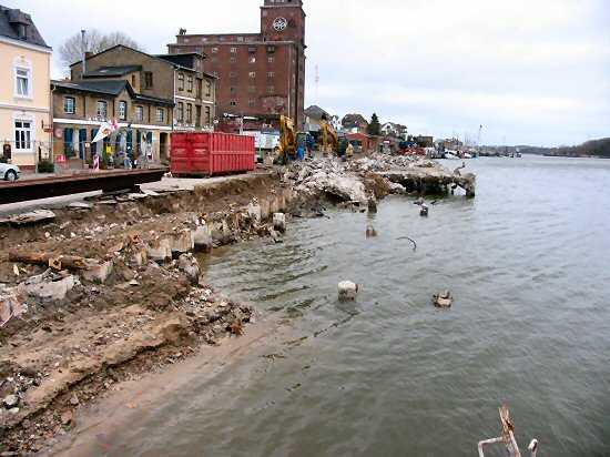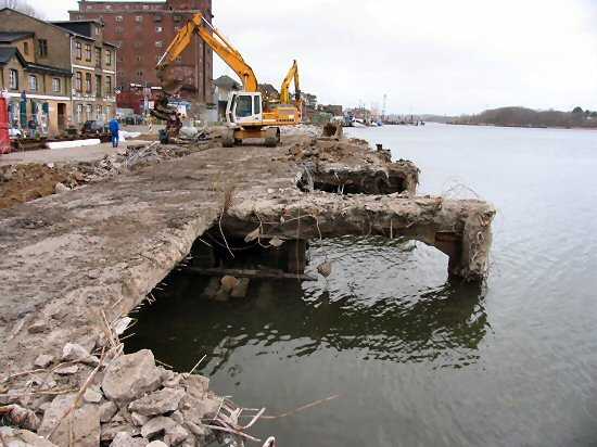 | 04.01.2005 - Nordhafen: Abriss Spannbetonkaiplatte und Neubau Tagesliegerhafen Hier kann man an der Wasserseite der Spundwand einige der eingehängten trapezförmigen Betonteile erkennen. |