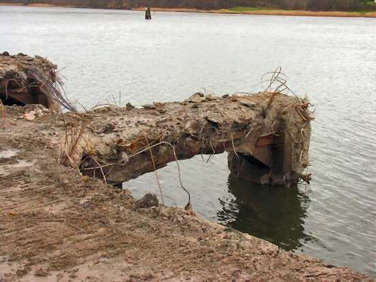| 04.01.2005 - Nordhafen: Abriss Spannbetonkaiplatte und Neubau Tagesliegerhafen Blick auf einen der vier Betonbalken der Pierplatte 6. Vorne (rechts) ruht er noch auf einem Stahlbetonpfahl. |