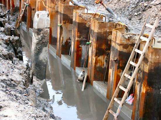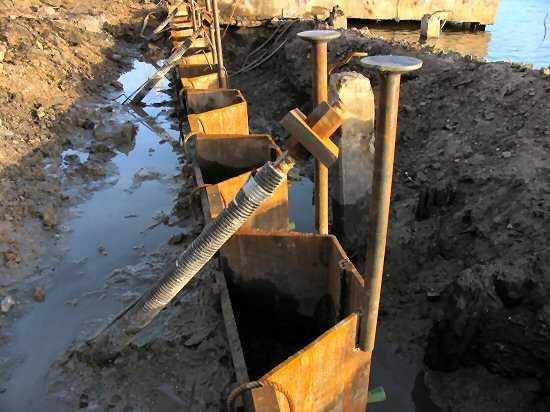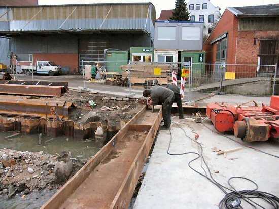| 04.01.2005 - Nordhafen: Abriss Spannbetonkaiplatte und Neubau Tagesliegerhafen Das Wasser aus dem Graben vor der Spundwand ist ziemlich herausgepumpt. Jetzt kann man von oben schön die eingehängten trapezförmigen Betonteile erkennen. |
