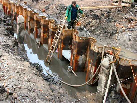 | 05.01.2005 - Nordhafen: Abriss Spannbetonkaiplatte und Neubau Tagesliegerhafen Das Kabel wird nach der Reparatur tiefer parallel zu einem zweiten Kabel verlegt. |